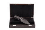 Hand engraved knife produced in a single copy. Fixed blade knife. Blade of Bohler N695 steel. Very profound hand engraved pictures on both sides. Two fighting buffalos and savannah landscape depicted on one side. A mother buffalo and a calf attacked by a leopard and savannah landscape engraved on the opposite side. A hand satin finish involves sanding the blade in one direction with increasing degrees of a fine abrasive. A satin finish shows the bevels of the blade, showcasing the lines of the knife, while reducing its reflective glare.